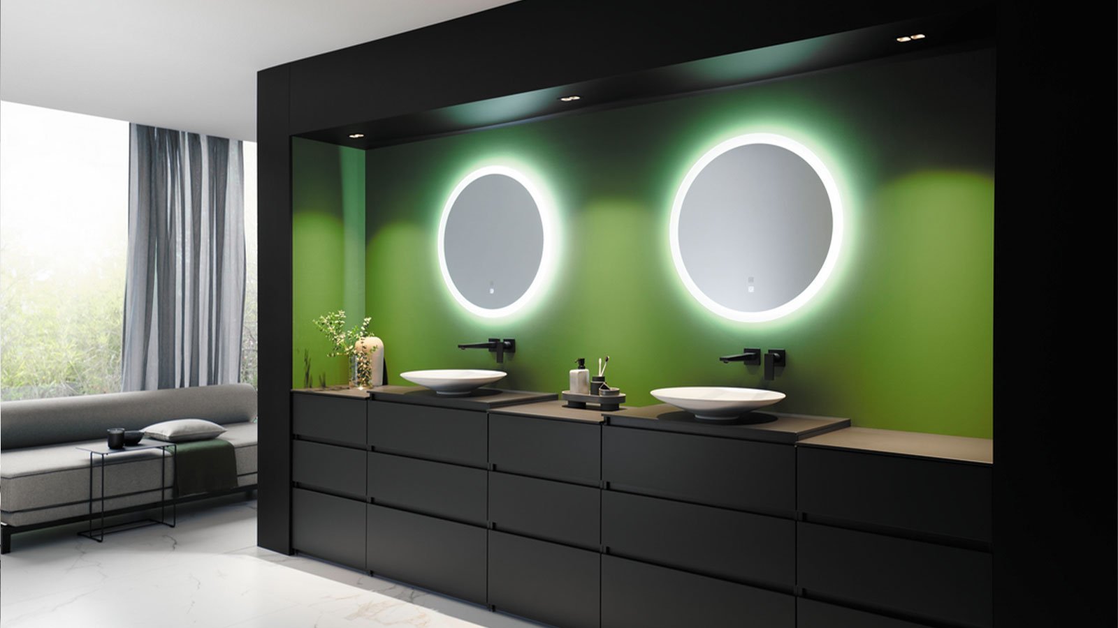 Griffloses Design für die Bildung von eindrucksvollen „Badzeilen“ ermöglicht viel Stauraum und stimmungsvolles Licht.
